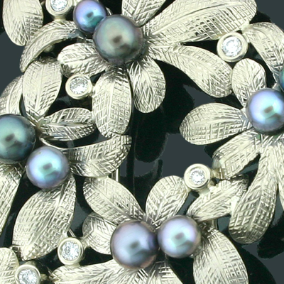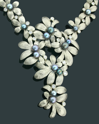 “Arctic Blackberry”, 2005, neckpiece with detachable brooch, 18Kt WG, black pearls, diamonds, 22x 12 cm