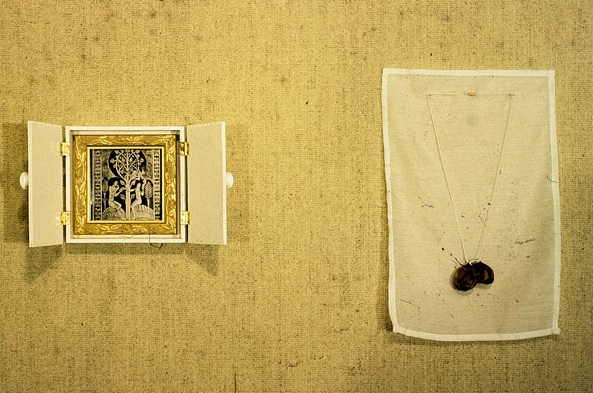 “Illuminate: Tempted”, 1996, Photo, Wood, Linen, Dried Figs, 20 x 30 cm