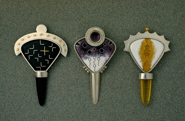 “Shields”, 1987, Sterling, 24k Gold, Cloisonné Enamel, Slate, Amethyst, Amber, 6.5 x 4 x .5 cm