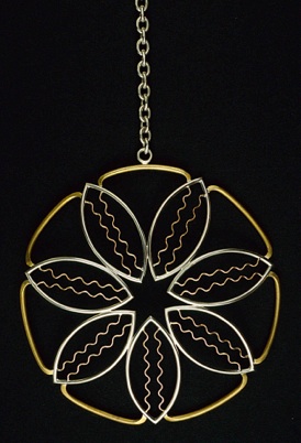 “Stars Are Suns: Cowrie Charm, 1999, Sterling Silver, 14K, Brass, 56 x 11.5 x .5 cm